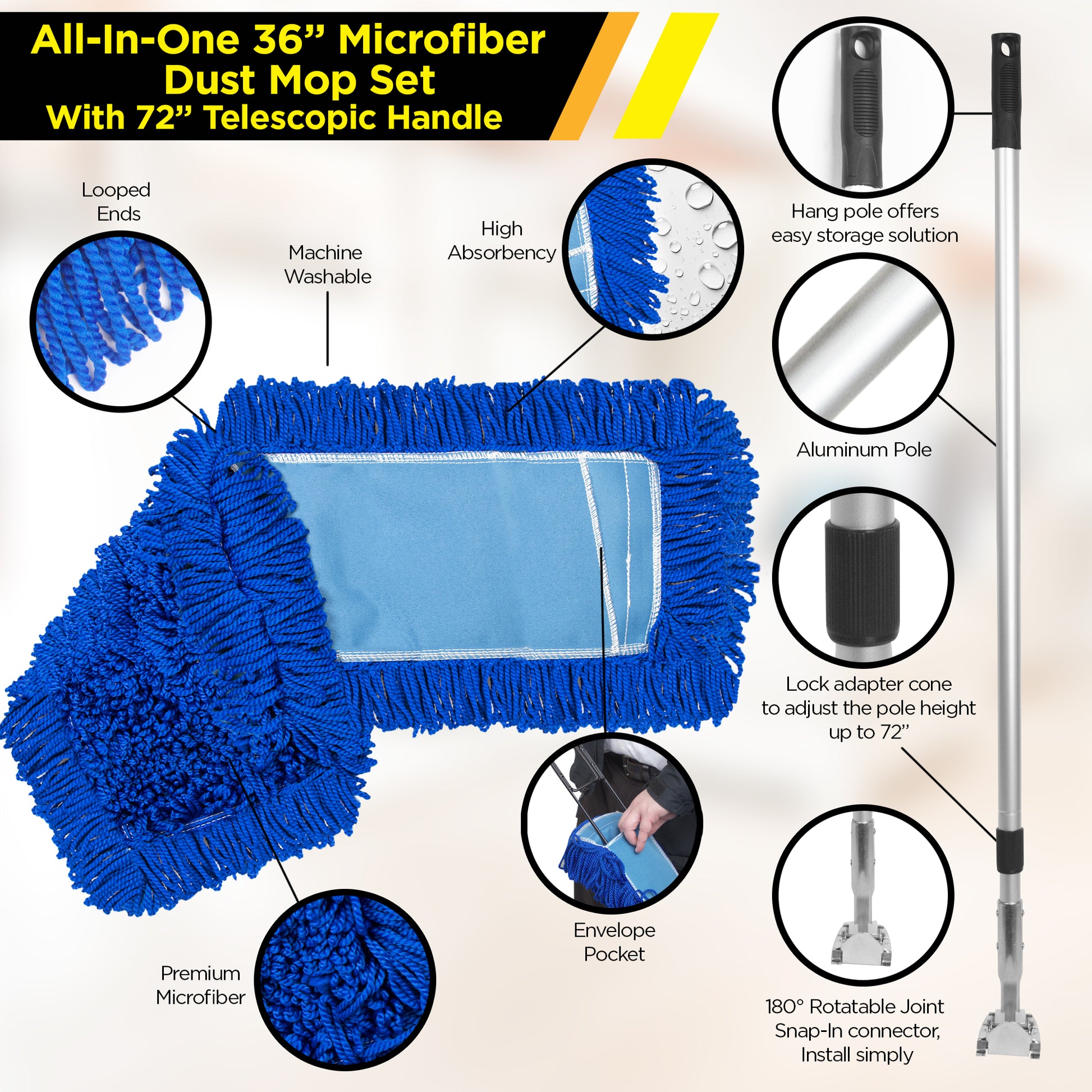 The Gritt Commercial all-in-one microfiber dust/dry mop with a 72" Telescopic handle offers a comprehensive solution for maintaining dust and dirt-free floors. It includes a telescopic handle, wire frame, and mop head, eliminating the need to purchase individual components.