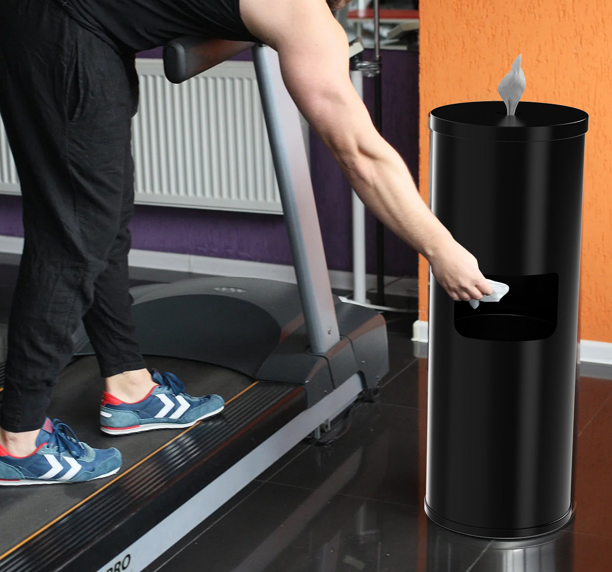 Whether you manage a gym, spa, hospital, assisted living community, or restaurant, our sleek Gritt Commercial Stainless Steel floor dispenser streamlines the process for guests to swiftly sanitize equipment or any non-porous surfaces. Featuring a handy pop-up dispenser atop, this trash receptacle accommodates center-pull disinfecting wipe refill rolls, ensuring effortless access to wipes alongside a designated trash bin. Crafted with durability in mind, its powder-coated design minimizes chipping, fading, and scratching, allowing placement at your establishment's entrance or front-of-house area. Its decorative protective finish complements any decor seamlessly. The easy access door allows you to empty waste receptacle and with an improved nozzle allows for hassle free wipe dispensing. Commercial size trash can with a large capacity to hold trash and other disposables. Each Stainless-Steel Standing Gym Wipe Dispenser with a Trash Can comes with a convenient wipe holding bucket and with a premium opening, making dispensing hassle-free. Made from heavy duty stainless steel for long lasting use.
